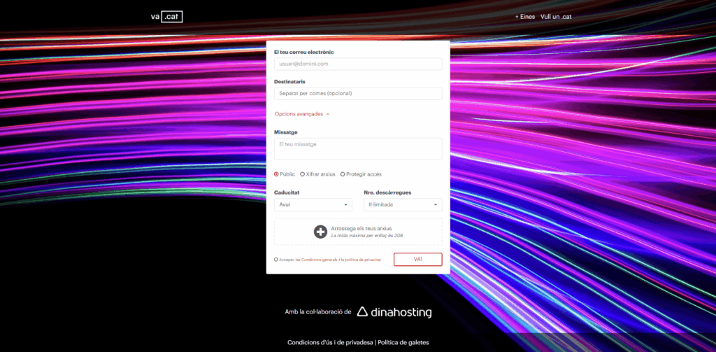 Si el que necessites és compartir arxius de manera segura, tens a la teva disposició va.cat, una eina en línia pensada per enviar fitxers de forma fàcil i protegida.