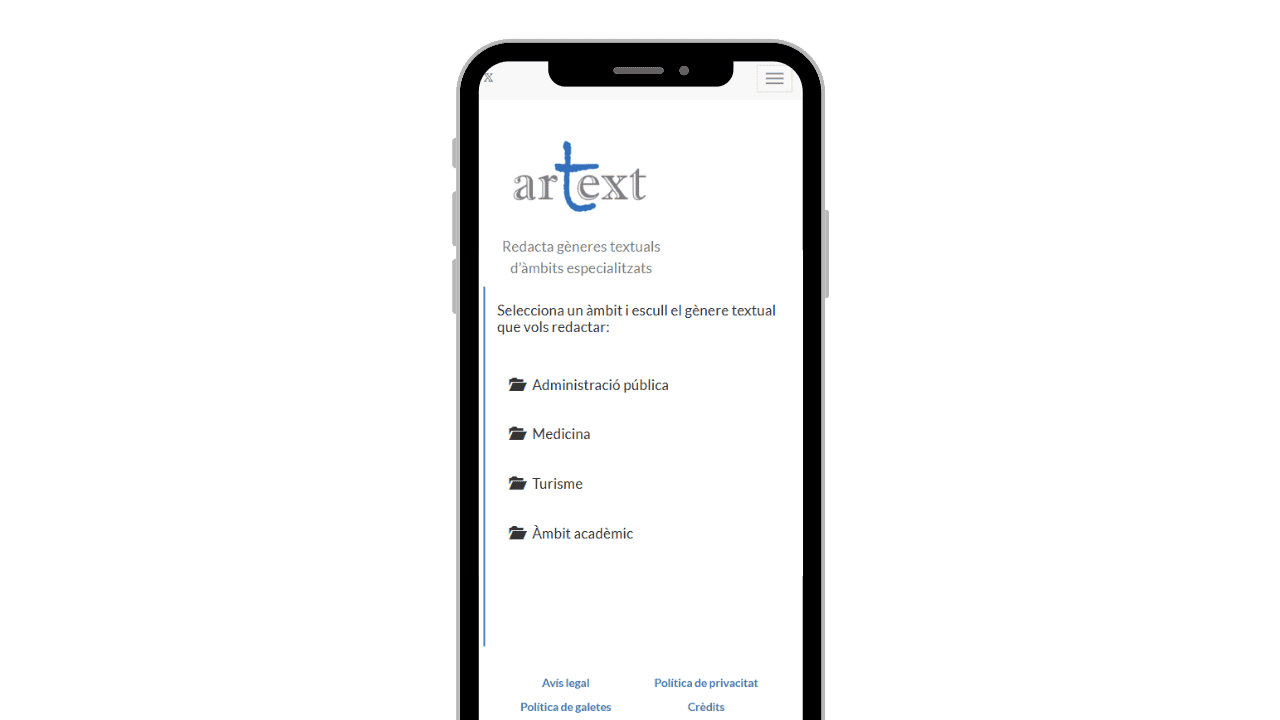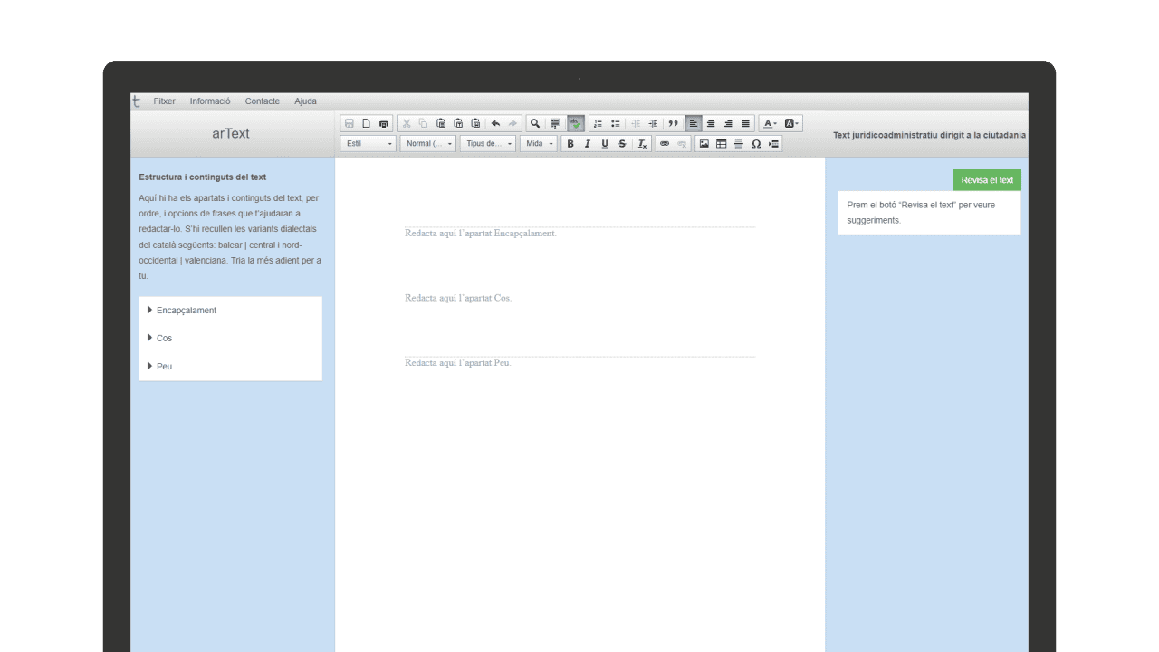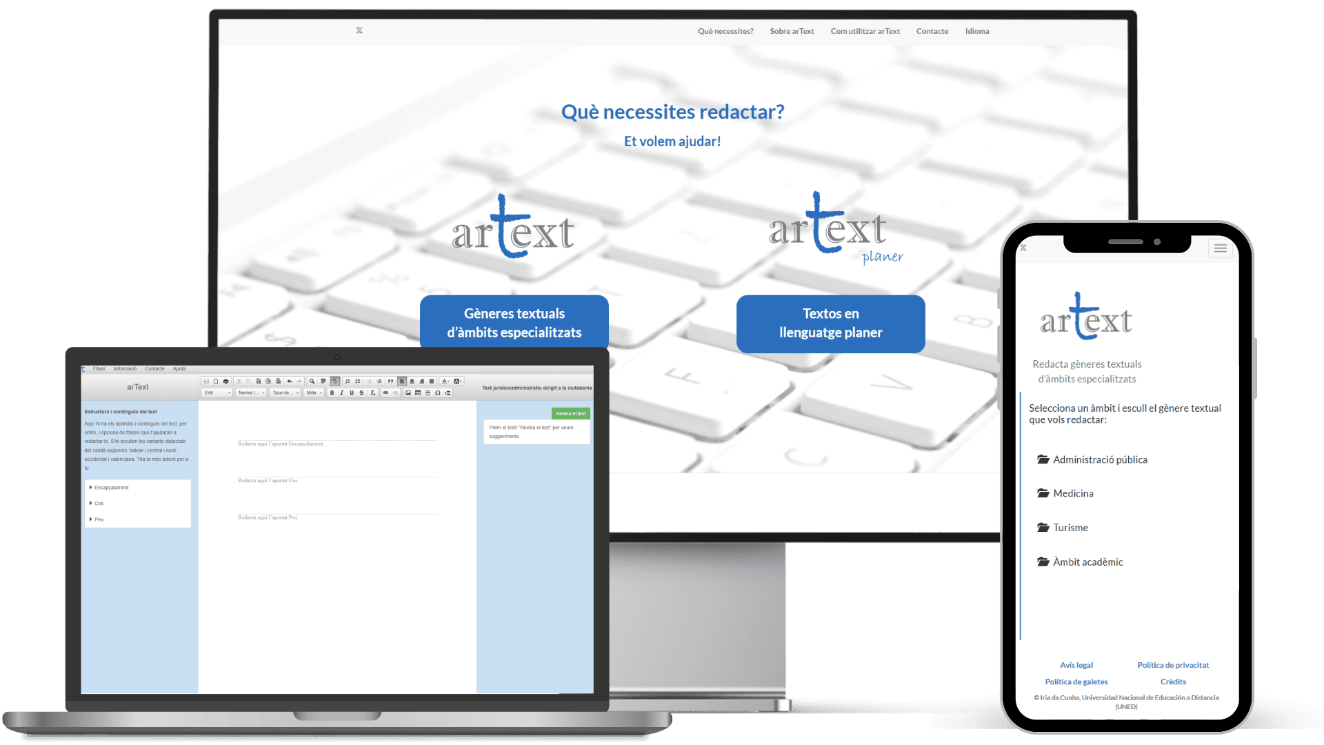 arText és el primer redactor assistit per a la llengua catalana orientat a la redacció de textos d’àmbits especialitzats i de llenguatge planer. És una eina gratuïta i en línia que t’ajuda a estructurar, redactar i millorar textos, respectant les variants dialectals.