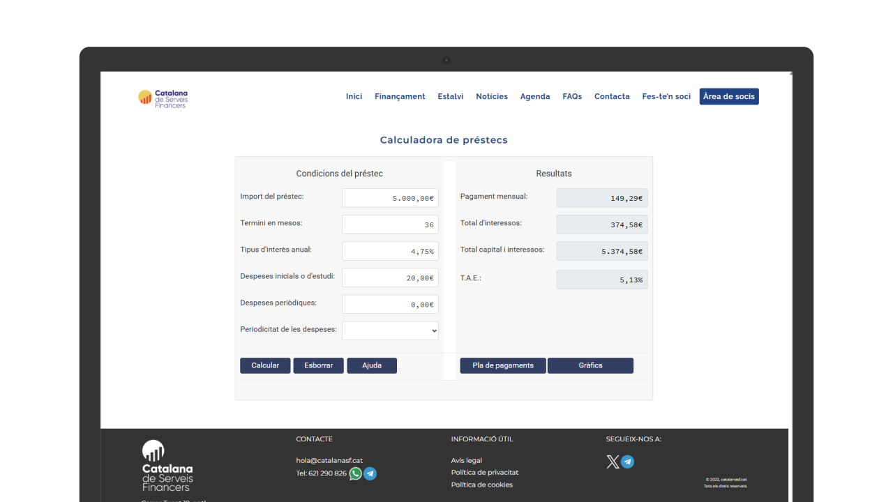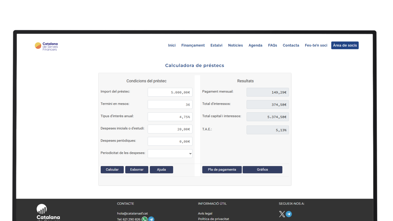La calculadora de préstecs de Catalana de Serveis Financers permet estimar de manera immediata la quota mensual d’un préstec personal a partir de l’import, el termini i el tipus d’interès. L’eina genera una simulació clara amb les dades bàsiques del finançament i ajuda a entendre l’impacte de cada variable en el cost final.
