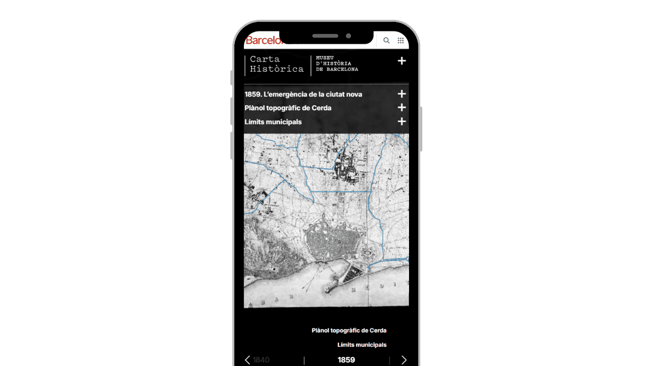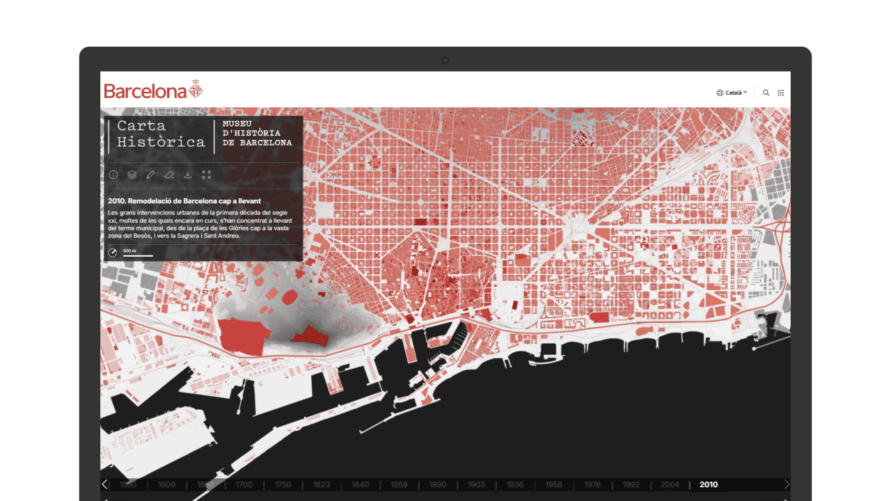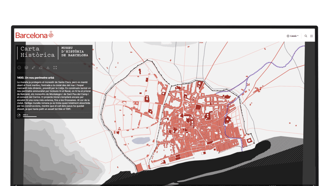 La Carta Històrica de Barcelona és un recurs digital del MUHBA que narra l’evolució de la ciutat a través dels mapes que l’han representada al llarg dels segles. Reuneix cartografies històriques georeferenciades que permeten comparar èpoques, entendre transformacions urbanes i descobrir com ha canviat Barcelona al llarg del temps.