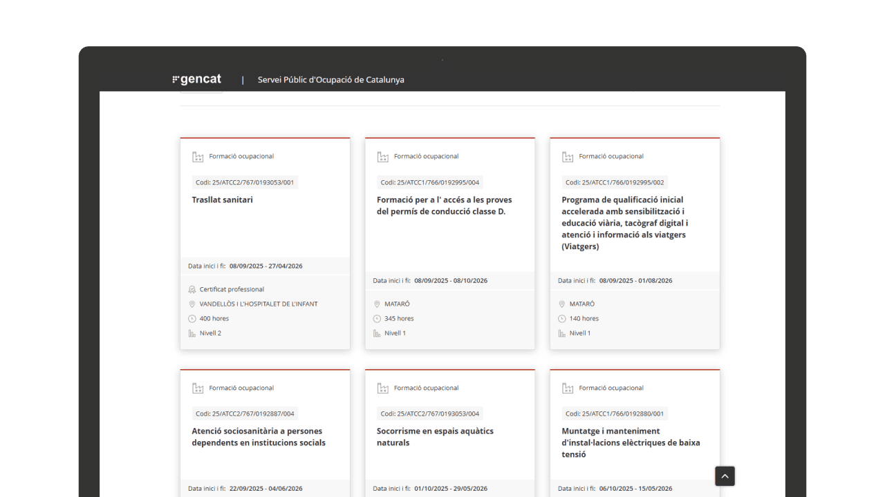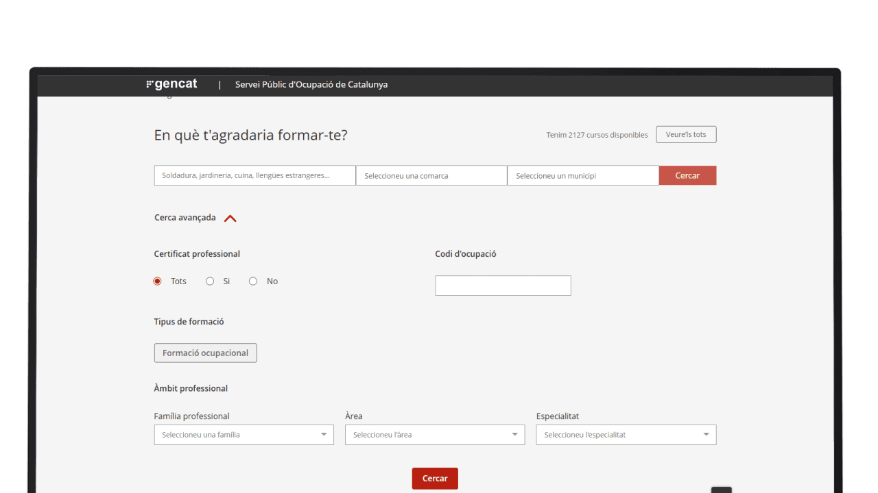 El Cercador integrat de formació del Servei Públic d’Ocupació de Catalunya permet consultar de manera centralitzada l’oferta formativa disponible a Catalunya. A través d’un únic cercador, facilita trobar cursos i especialitats formatives segons criteris com l’àmbit professional, el nivell, la modalitat o la localització, amb l’objectiu de millorar l’ocupabilitat i l’orientació professional.