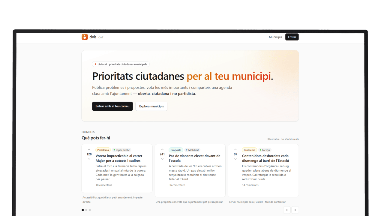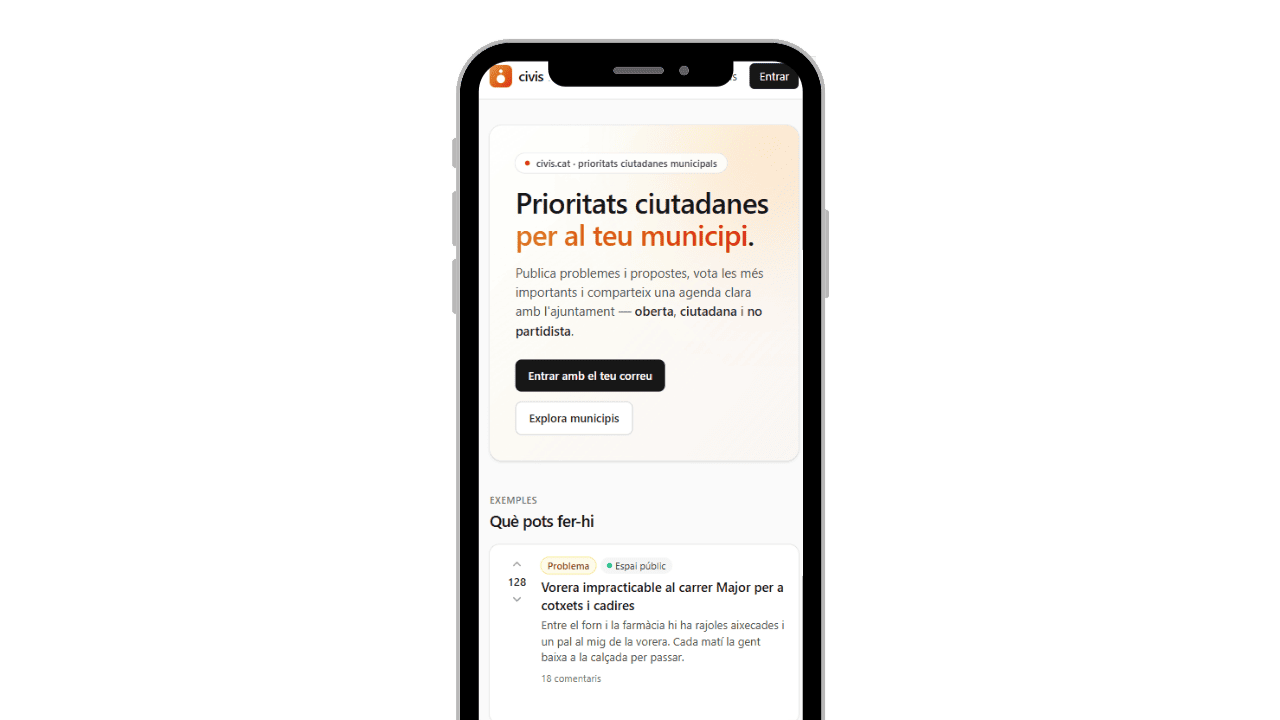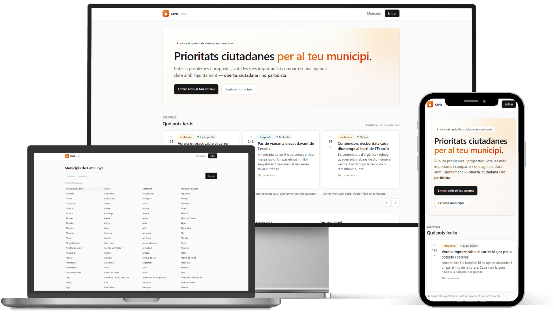 Civis.cat és una plataforma cívica independent per publicar problemes i propostes municipals, votar les més importants i compartir una agenda clara amb l’ajuntament.