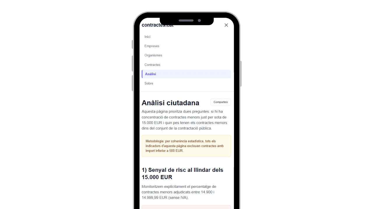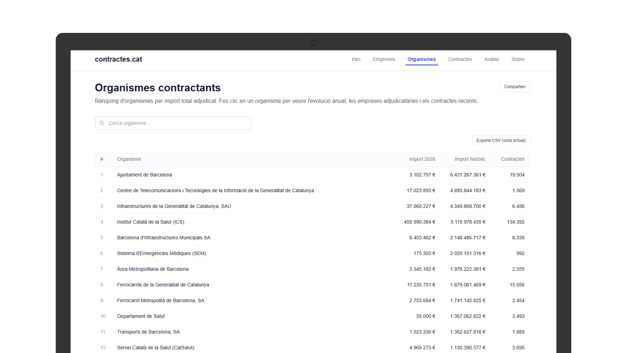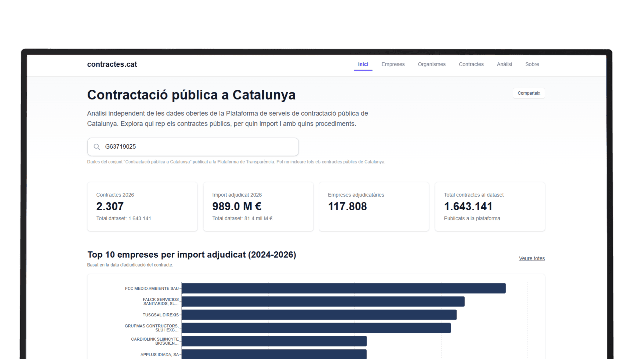 - Exploració de contractes públics: cercador i filtres per consultar tots els contractes publicats a la Plataforma de serveis de contractació pública de Catalunya.