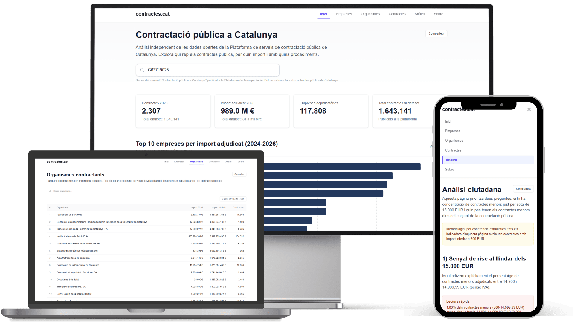 Contractes.cat és una plataforma d’anàlisi de dades obertes que permet explorar i entendre com es gasten els diners públics en contractació a Catalunya. Fa accessible informació que ja és pública però sovint complexa de consultar, facilitant la transparència i la comprensió de l’activitat contractual de les administracions públiques.