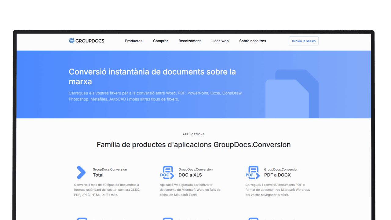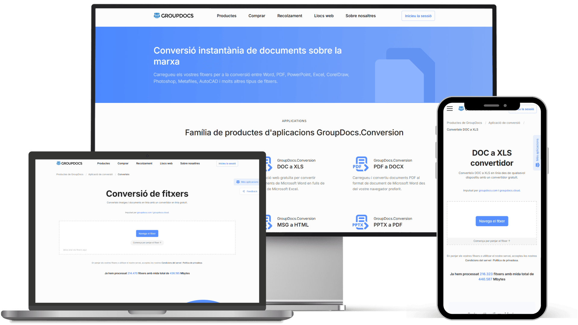 El convertidor de fitxers de GroupDocs és una suite d’eines en línia per convertir documents entre més de 50 formats: Word, PDF, Excel, PowerPoint, imatges, AutoCAD, Visio i molts altres.