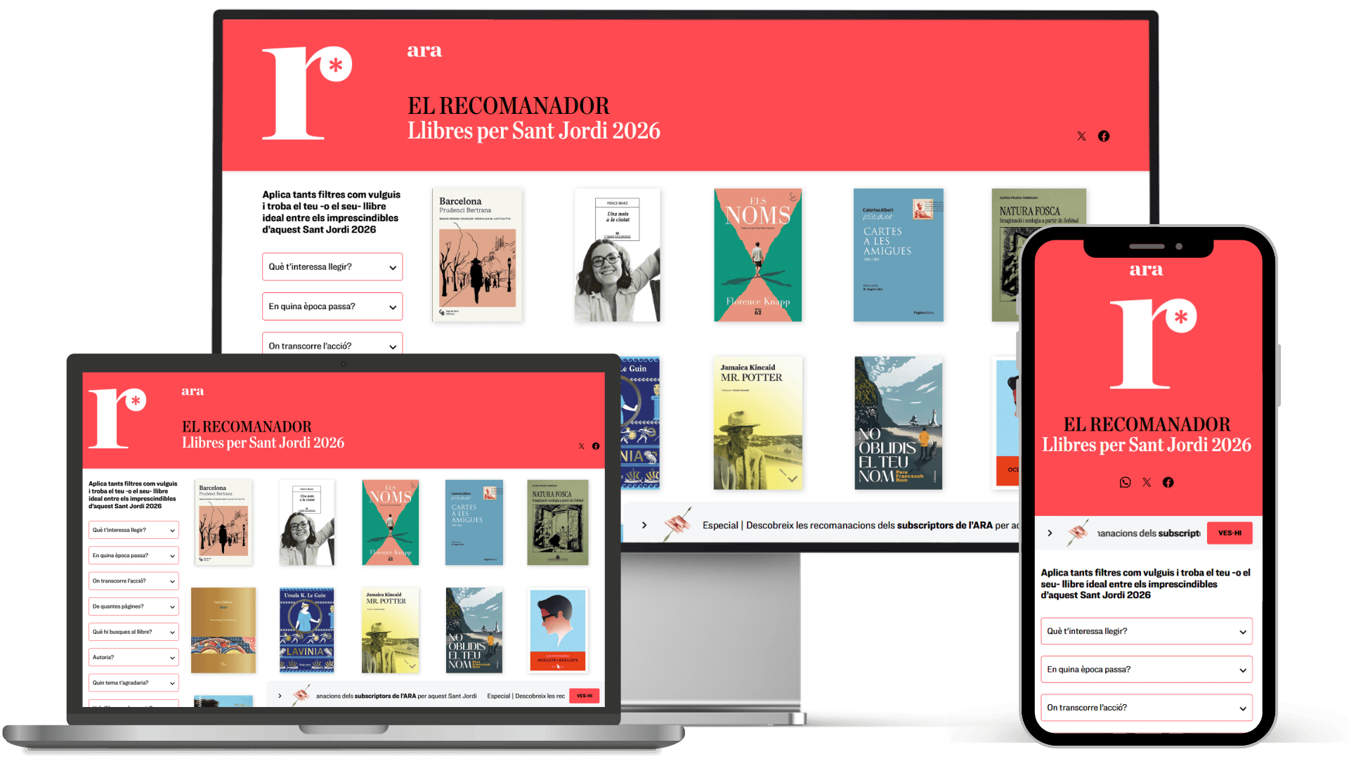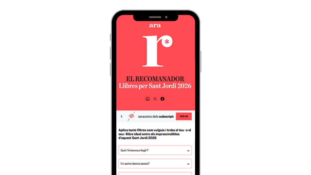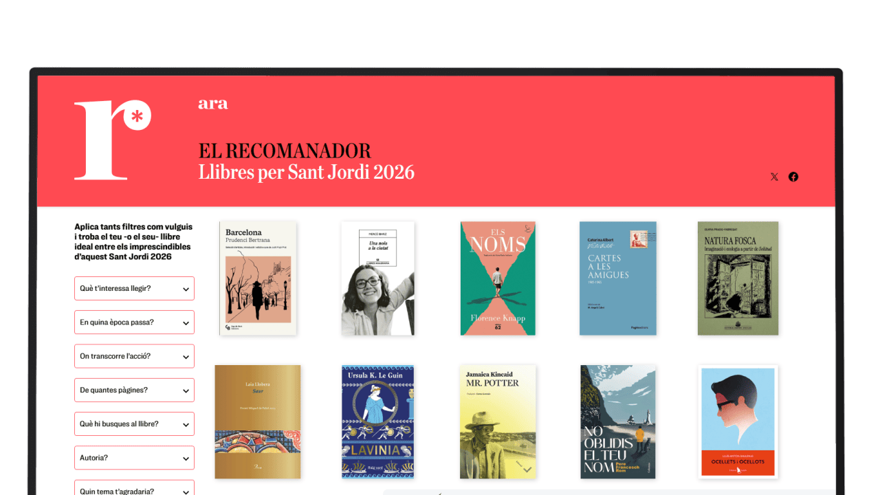 El recomanador de Sant Jordi és una eina interactiva del diari ARA que ajuda a trobar el llibre ideal entre els títols imprescindibles de cada Sant Jordi. Mitjançant filtres per gènere, temàtica, època i premis, permet afinar la cerca fins a trobar la lectura perfecta. S’actualitza cada any i conserva l’arxiu de totes les edicions anteriors.