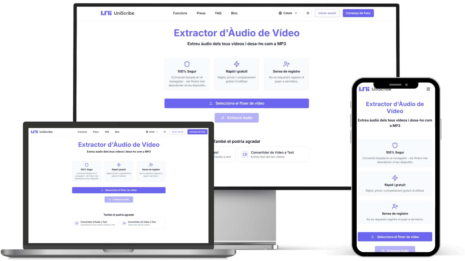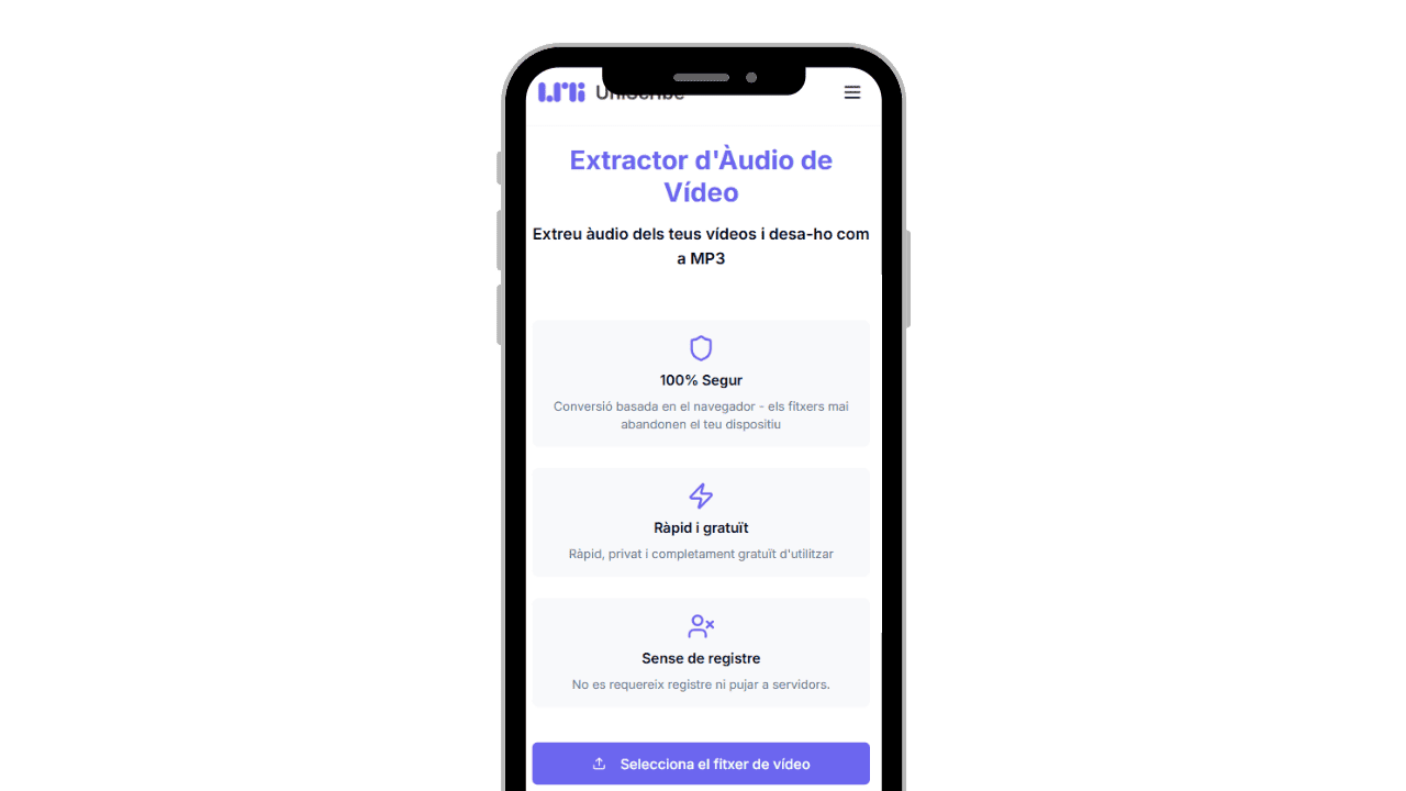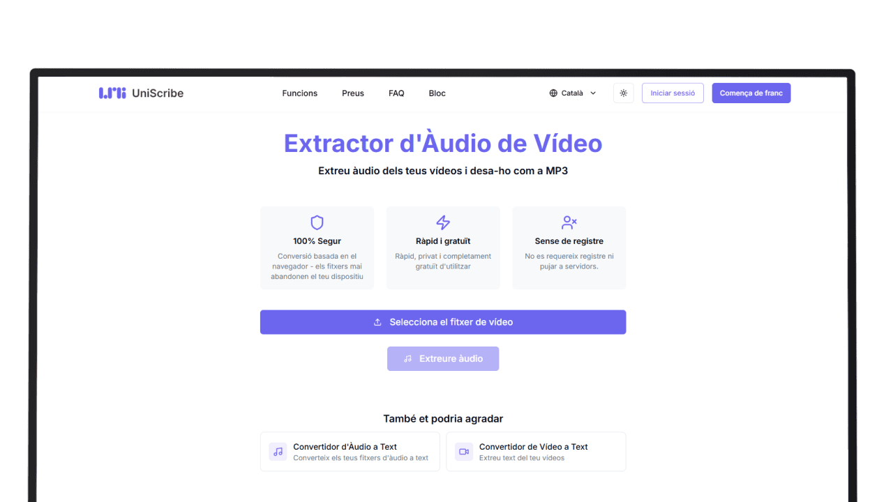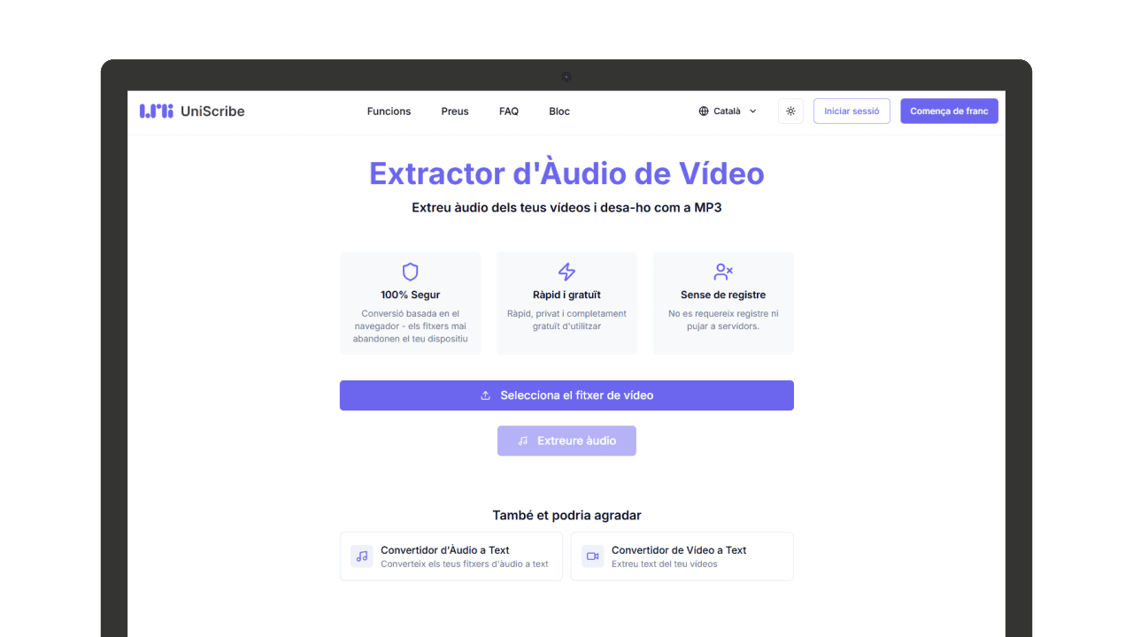 L’Extractor d’Àudio de Vídeo de UniScribe és una eina gratuïta que permet extreure l’àudio d’un vídeo i desar-lo en format MP3 directament des del navegador. La conversió es fa al dispositiu de l’usuari, sense pujar cap fitxer a cap servidor extern.