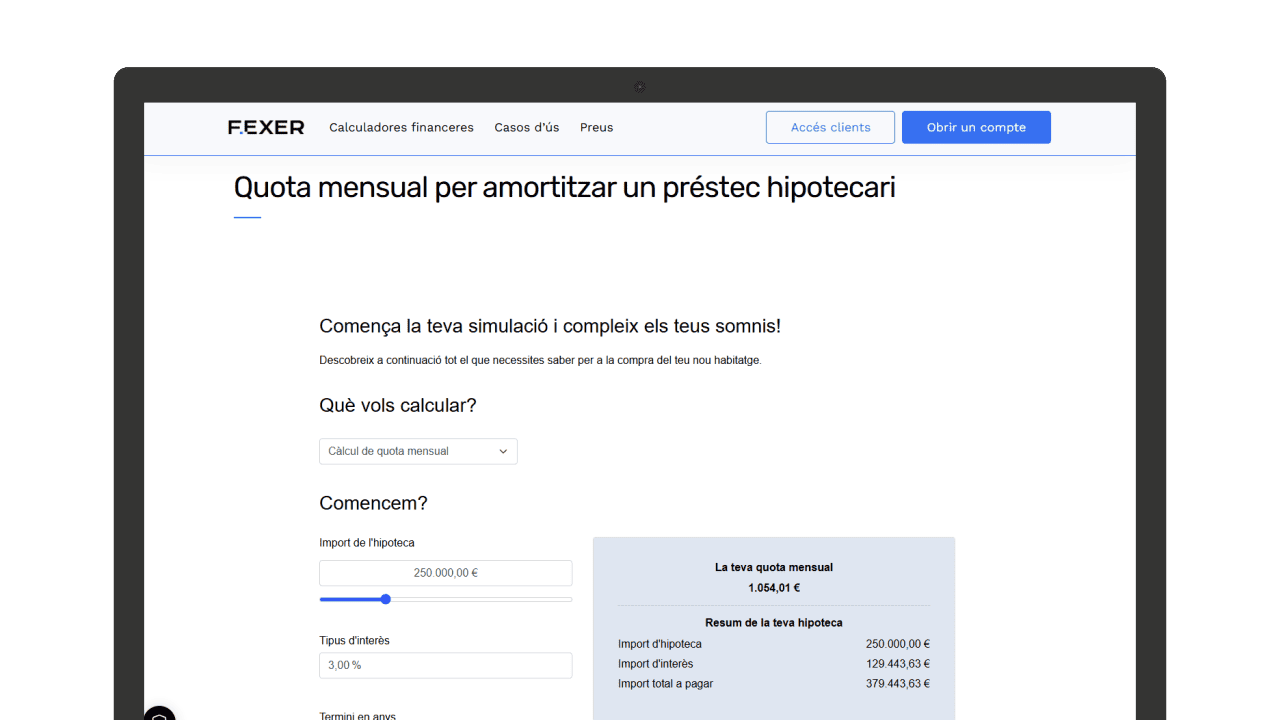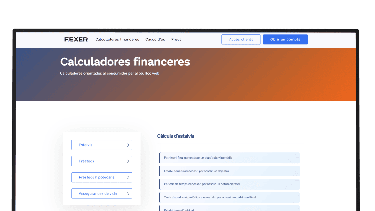 Les calculadores financeres de Fexer són un conjunt complet d’eines per planificar decisions econòmiques complexes: estalvi i inversions, préstecs personals, hipoteques i assegurances de vida. Permeten calcular resultats detallats —quotes, terminis, imports, patrimoni final o aportacions necessàries— i generen taules i gràfics que faciliten la comprensió de l’evolució financera.