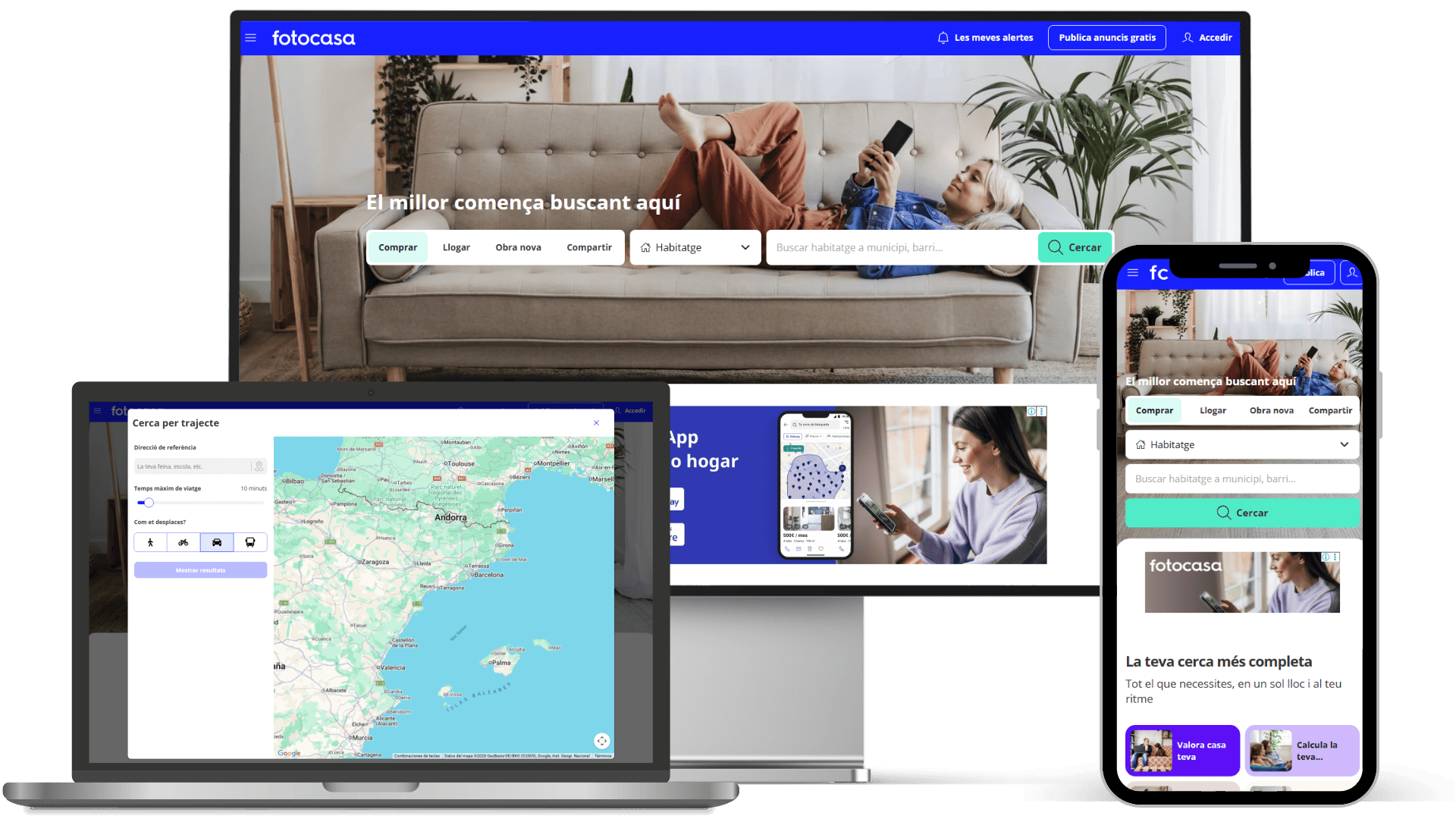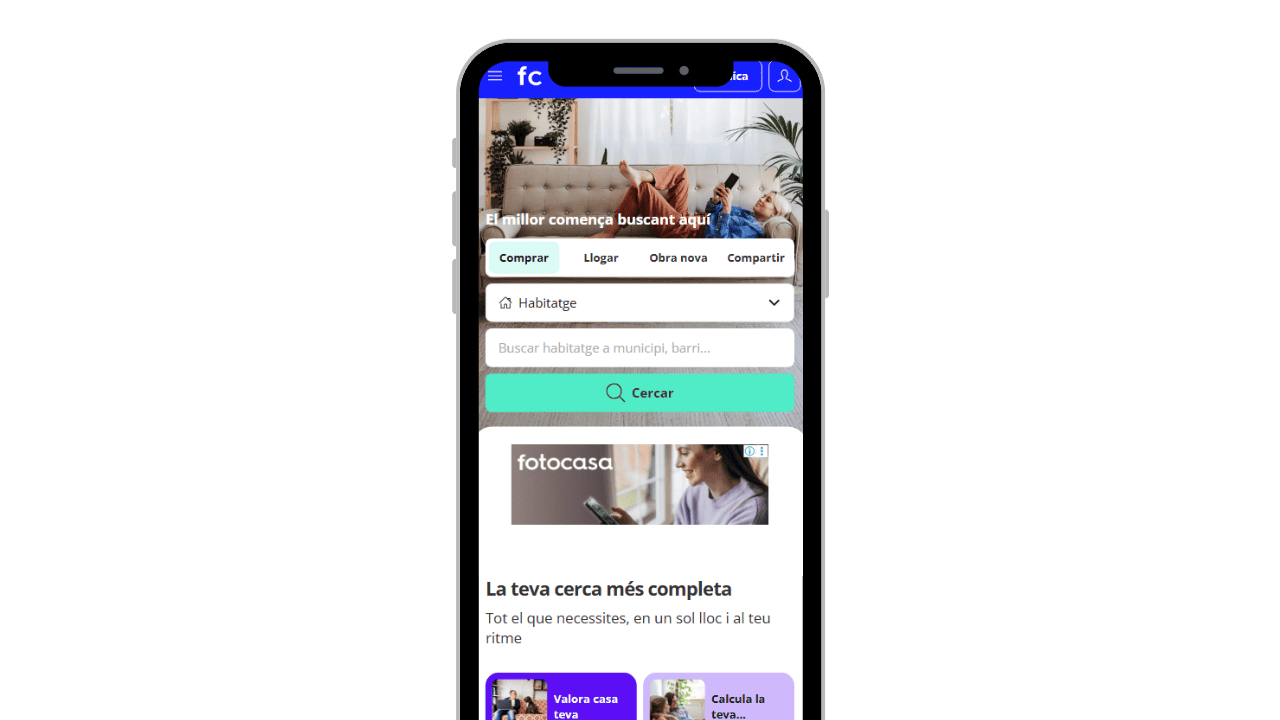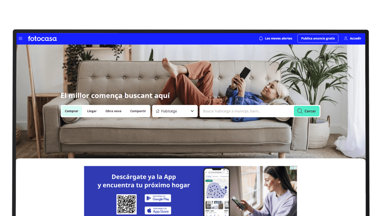 Fotocasa és un dels portals immobiliaris de referència a Espanya, amb més d’1,5 milions d’immobles disponibles per comprar, llogar o compartir. Disponible en català, inclou eines addicionals com el valorador d’habitatges i la calculadora d’hipoteques.