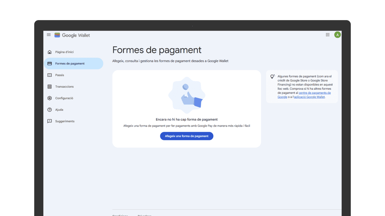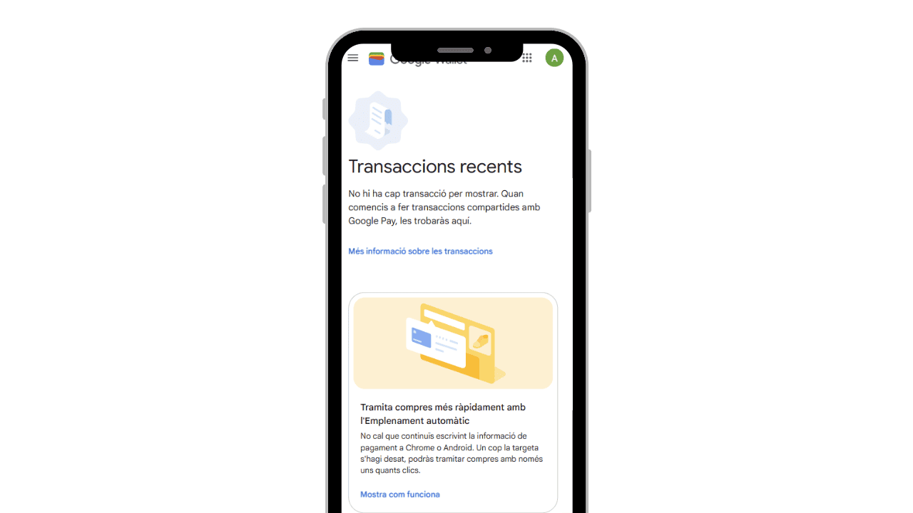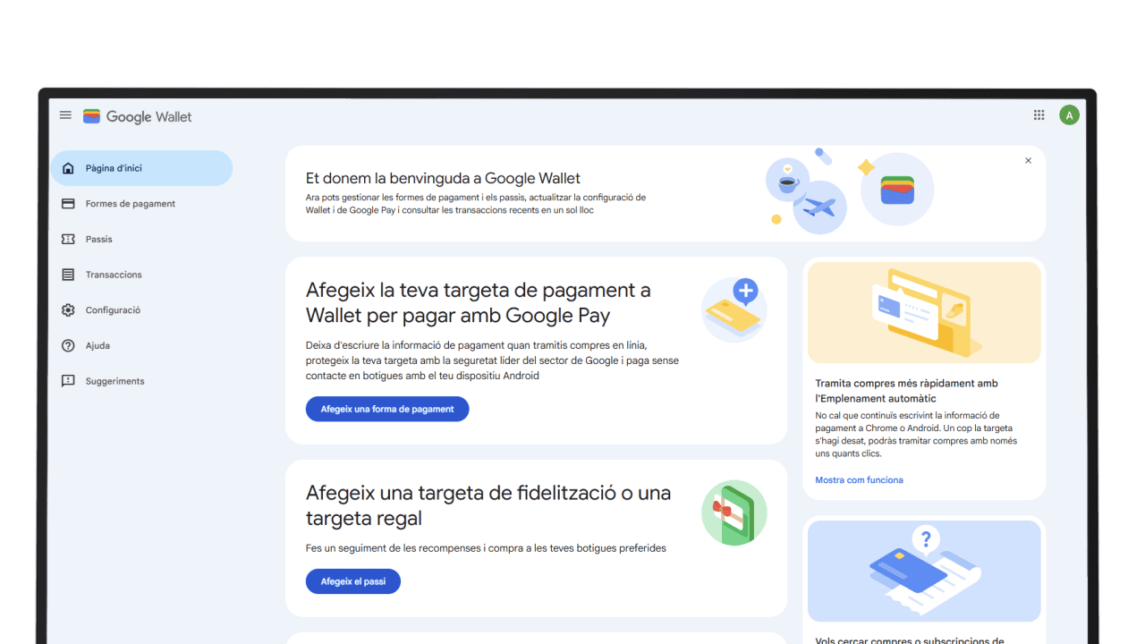 Google Wallet és un servei que permet guardar i gestionar de manera digital targetes de pagament, targetes de fidelització, bitllets, passis i altres documents digitals. Centralitza aquests elements en un sol espai per facilitar-ne l’accés i l’ús en serveis compatibles i entorns digitals segurs.