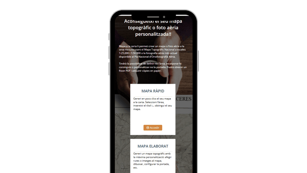 3. Diversos formats de sortida: mapa elaborat, mapa ràpid, mapa pòster (sense llegenda, ideal per emmarcar) i foto aèria a partir de les ortofotografies del Pla Nacional d’Ortofotografia Aèria (PNOA).