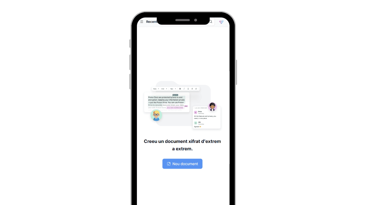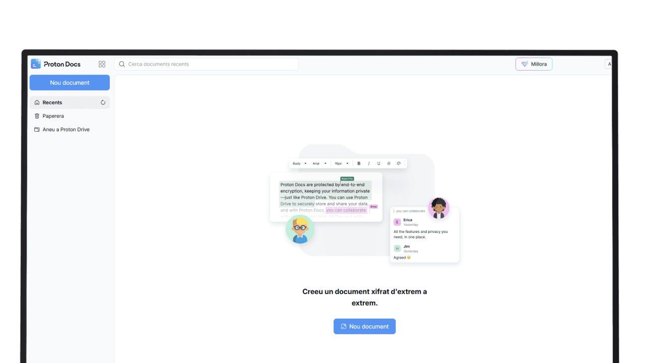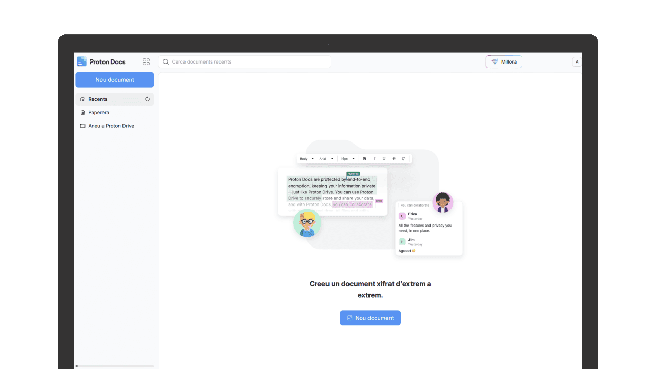- Privadesa per disseny: tots els documents estan protegits amb xifratge d’extrem a extrem, garantint que només tu i els teus col·laboradors podeu accedir-hi.