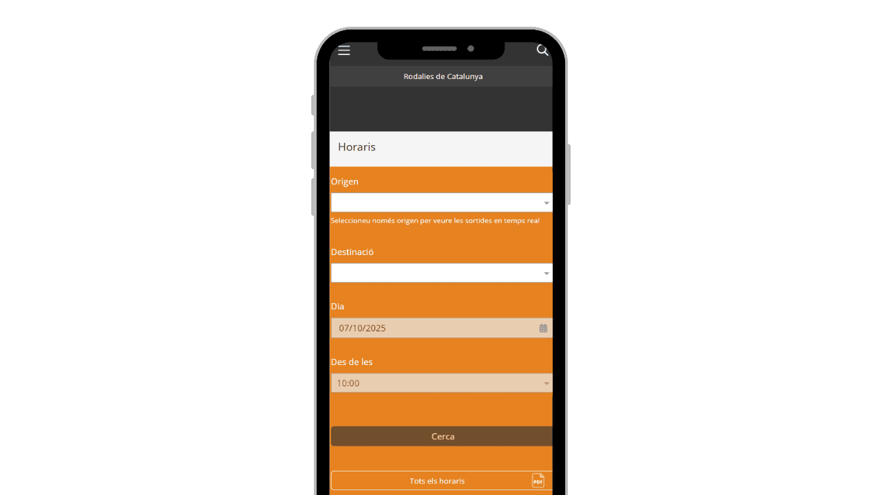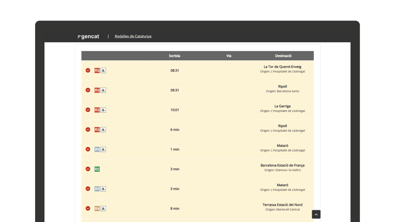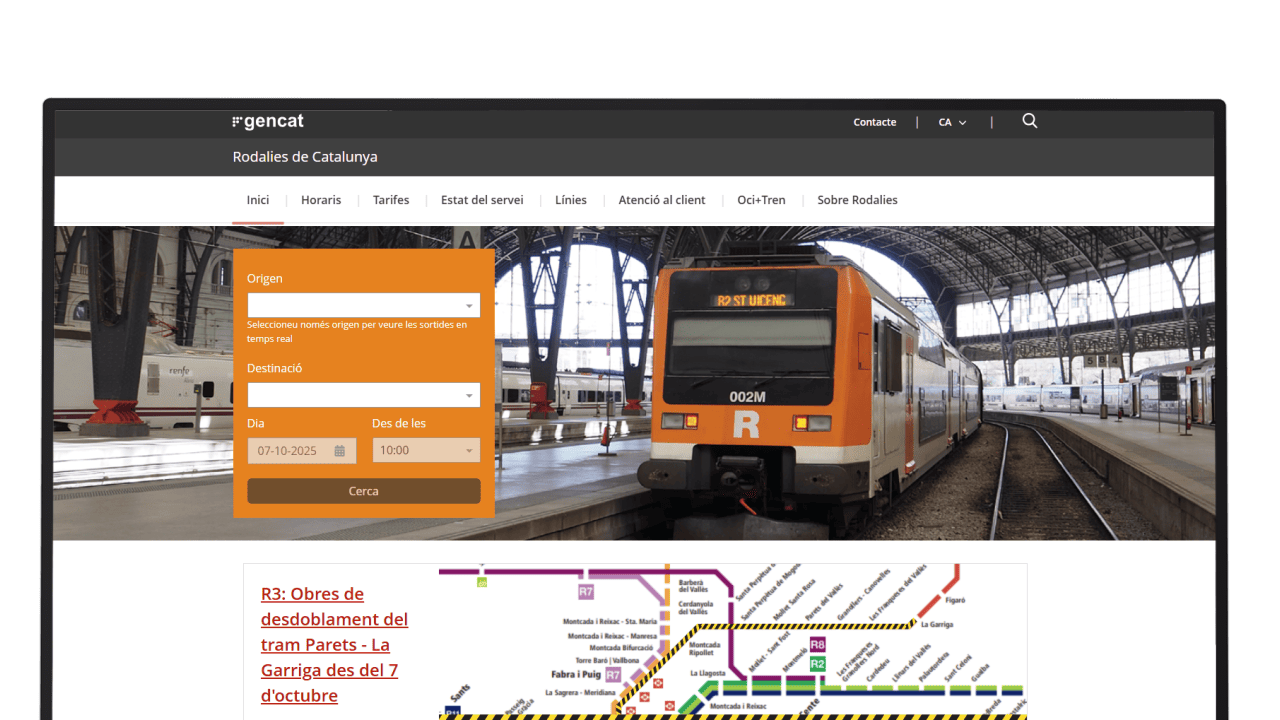 Rodalies de Catalunya és el portal oficial del servei ferroviari de proximitat gestionat per la Generalitat de Catalunya i operat per Renfe. L’eina permet consultar horaris, trajectes, tarifes, estacions i avisos d’incidències en temps real, tant per a Rodalies com per a Regionals.